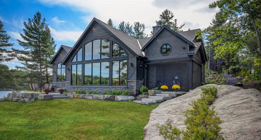 Fly to the cottage? Yes, please! As long time Kahshe Lakers, these clients searched for the perfect lot that had the most spectacular view. To maximize that perfect Muskoka vista, they designed a cottage with a magnificent curved gable wall of solid glass. The wall of windows greets you when you enter under the custom timber frame entrance, and brings endless light into the open living area. Each of the three bedrooms have their own ensuite and the golf simulator in the games room is the cherry on top. A matching garage and workshop on the property makes this a great family compound.